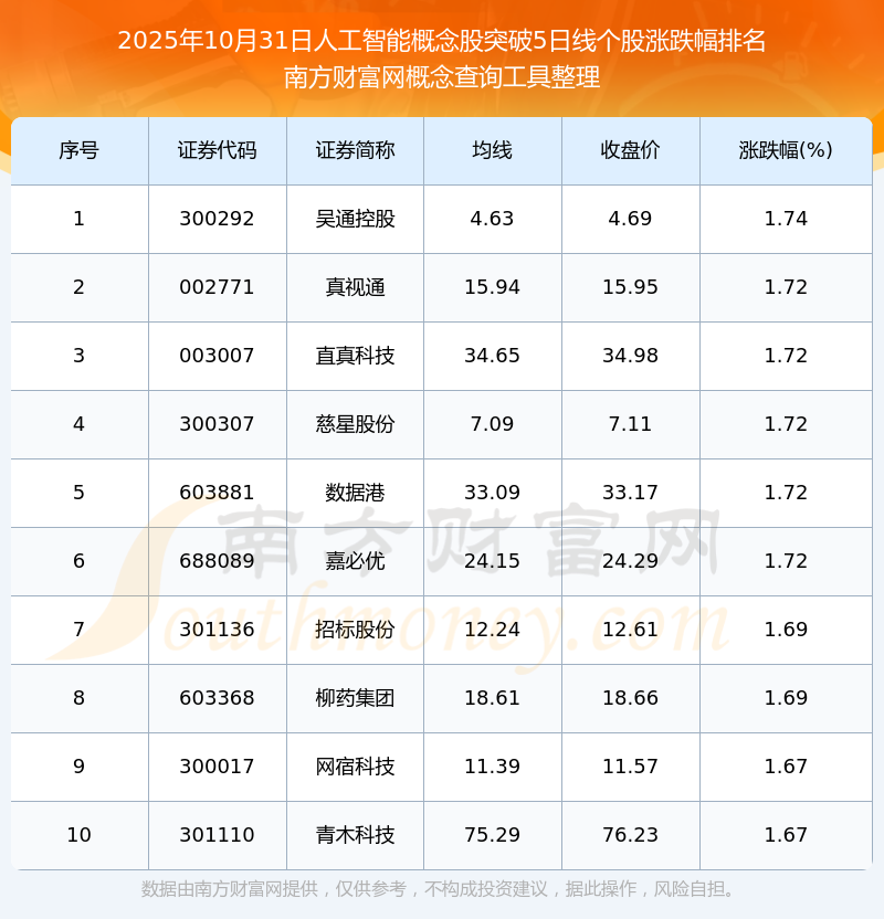 2025年10月31日人工智能概念股突破5日線個(gè)股漲跌幅排名