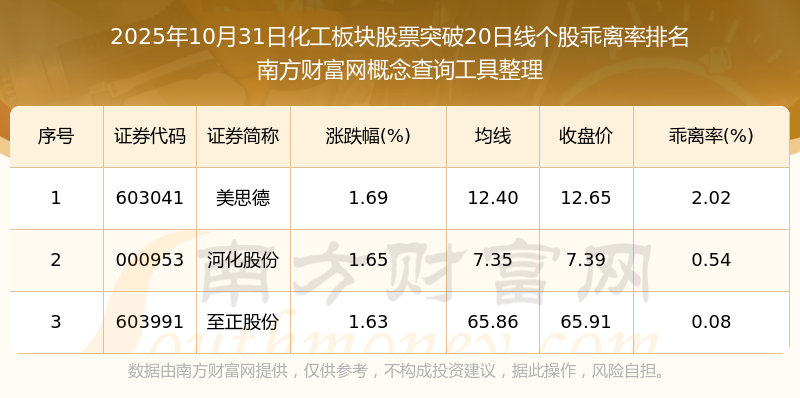 2025年10月31日化工板塊股票突破20日線個股乖離率排名