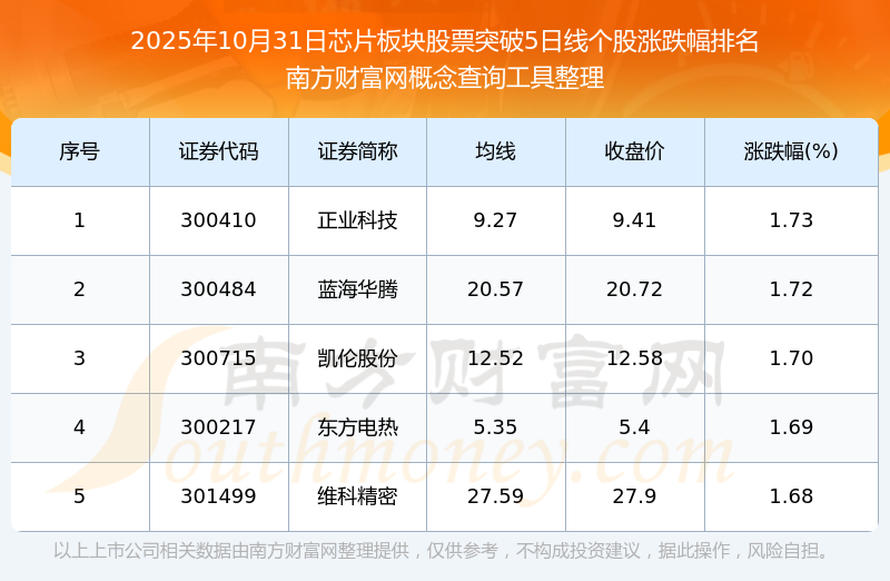 根據(jù)南方財富網(wǎng)概念查詢工具數(shù)據(jù)統(tǒng)計,截止2025年10月31日收盤,芯片板塊股票共有5只個股收盤價向上突破了5日線。其中漲幅較大的個股有正業(yè)科技、藍海華騰、凱倫股份等,漲幅分別為1.73%、1.72%、1.70%。