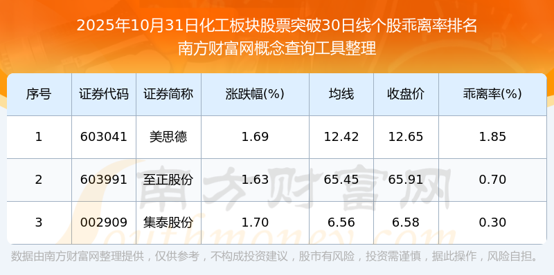 2025年10月31日化工板塊股票突破30日線個(gè)股乖離率排名