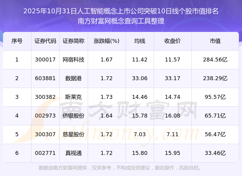 根據(jù)南方財富網(wǎng)概念查詢工具數(shù)據(jù)統(tǒng)計,截止2025年10月31日收盤,人工智能概念上市公司共有6只個股收盤價向上突破了10日線。其中市值較大的個股有網(wǎng)宿科技、數(shù)據(jù)港、斯萊克等,市值分別為284.56億、238.29億、95.57億。