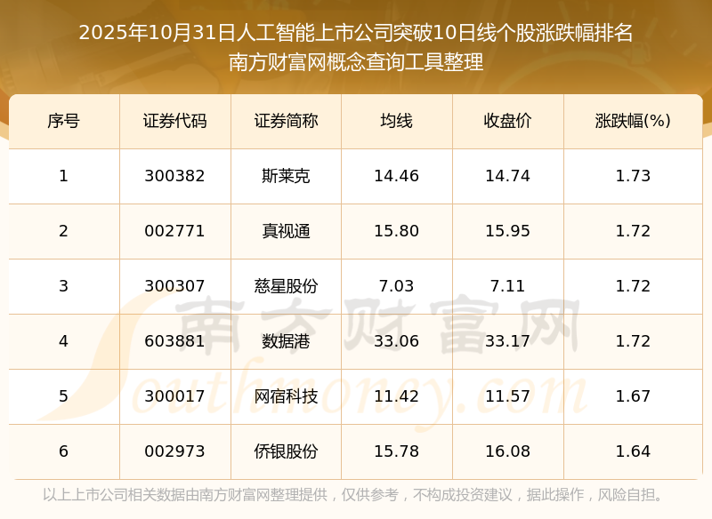 根據(jù)南方財(cái)富網(wǎng)概念查詢工具數(shù)據(jù)統(tǒng)計(jì),截止2025年10月31日收盤,人工智能上市公司共有6只個(gè)股收盤價(jià)向上突破了10日線。其中漲幅較大的個(gè)股有斯萊克、數(shù)據(jù)港、真視通等,漲幅分別為1.73%、1.72%、1.72%。