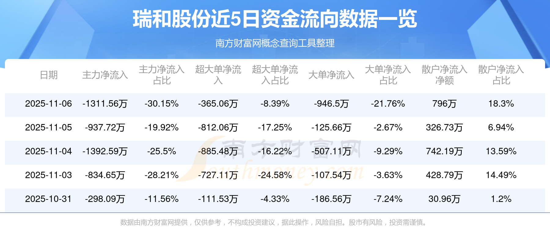 11月6日該股主力凈流出1311.56萬元,超大單凈流出365.06萬元,大單凈流出946.5萬元,中單凈流入515.56萬元,散戶凈流入796萬元。