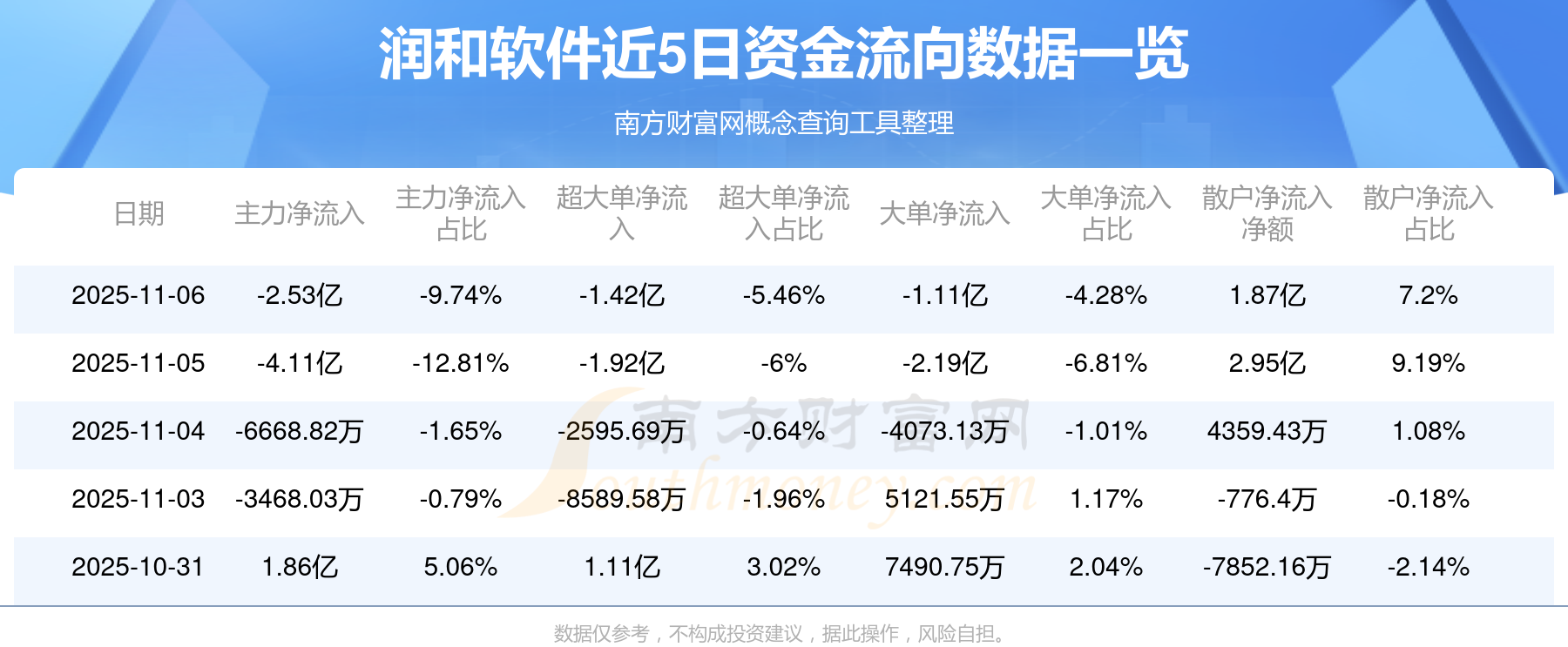 11月6日消息,潤(rùn)和軟件資金凈流出2.53億元,超大單資金凈流出1.42億元,換手率5.54%,成交金額25.97億元。