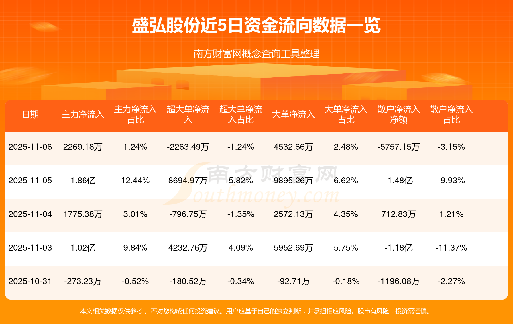 11月6日該股主力凈流入2269.18萬元,超大單凈流出2263.49萬元,大單凈流入4532.66萬元,中單凈流入3487.97萬元,散戶凈流出5757.15萬元。