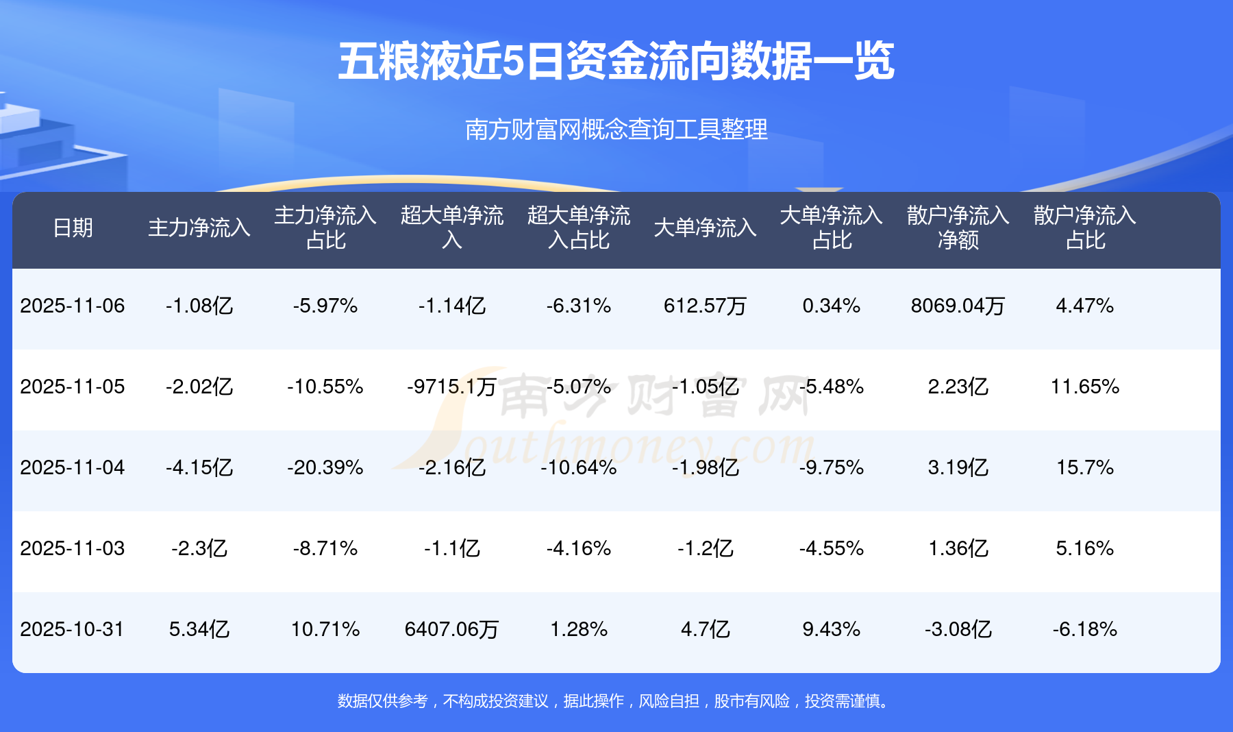 11月6日消息,五糧液主力凈流出1.08億元,超大單凈流出1.14億元,散戶凈流入8069.04萬元。
