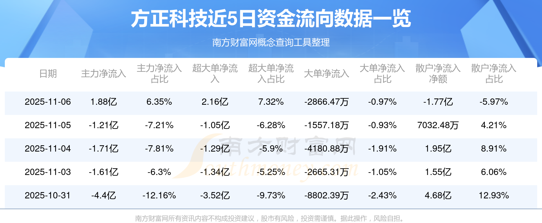 資金流向數(shù)據(jù)方面,11月6日主力資金凈流流入1.88億元,超大單資金凈流入2.16億元,大單資金凈流出2866.47萬元,散戶資金凈流出1.77億元。