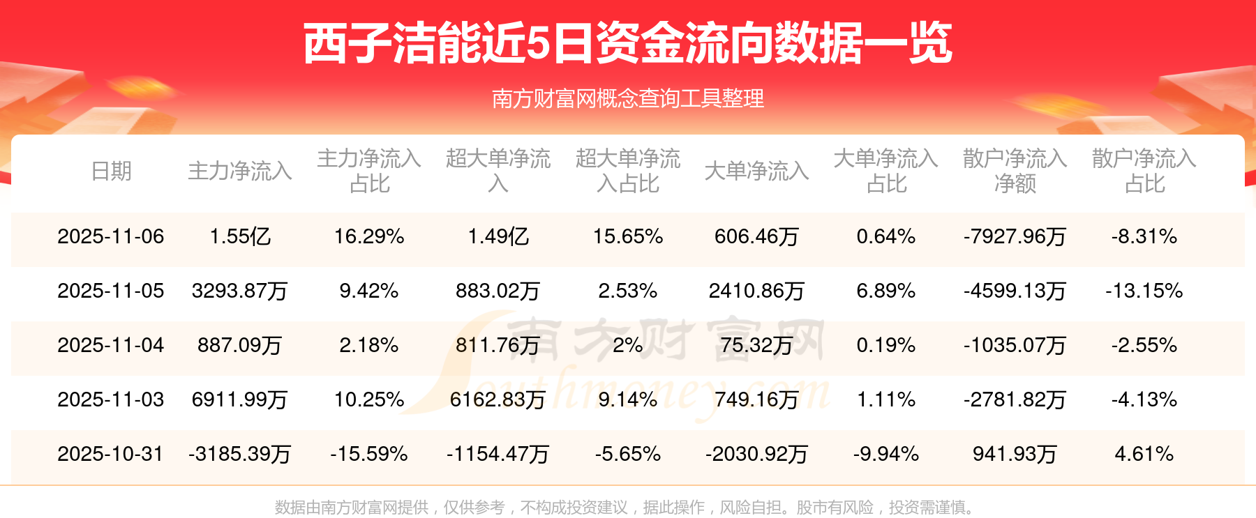 11月6日消息,西子潔能11月6日主力凈流入1.55億元,超大單凈流入1.49億元,大單凈流入606.46萬元,散戶凈流出7927.96萬元。