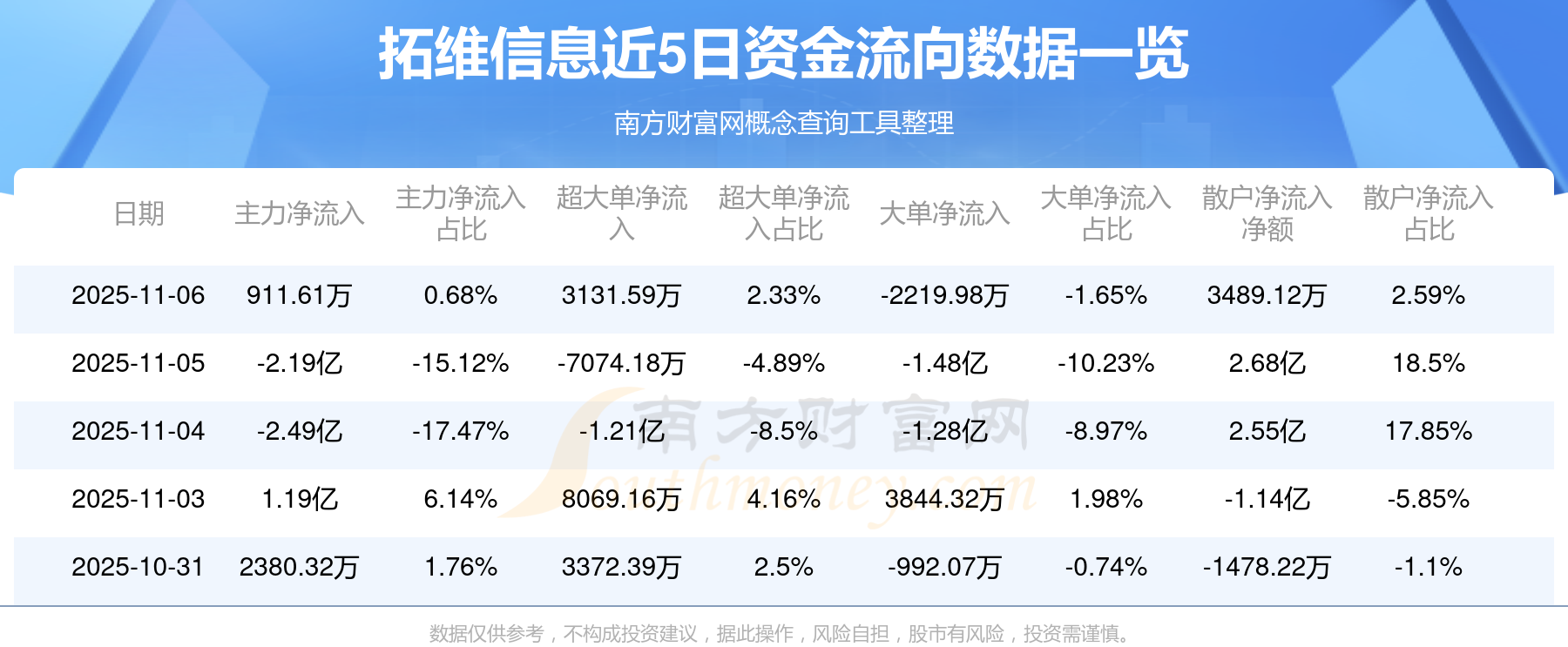 11月6日消息,拓維信息11月6日主力資金凈流入911.61萬元,超大單資金凈流入3131.59萬元,大單資金凈流出2219.98萬元,散戶資金凈流入3489.12萬元。