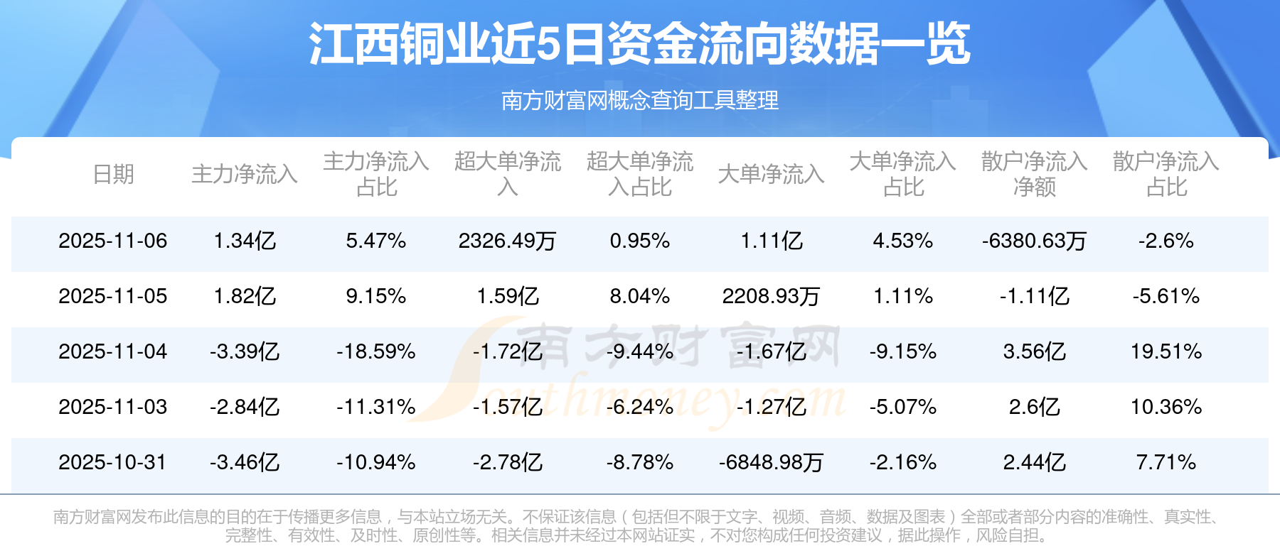 11月6日消息,江西銅業(yè)11月6日主力資金凈流入1.34億元,超大單資金凈流入2326.49萬(wàn)元,大單資金凈流入1.11億元,散戶資金凈流出6380.63萬(wàn)元。