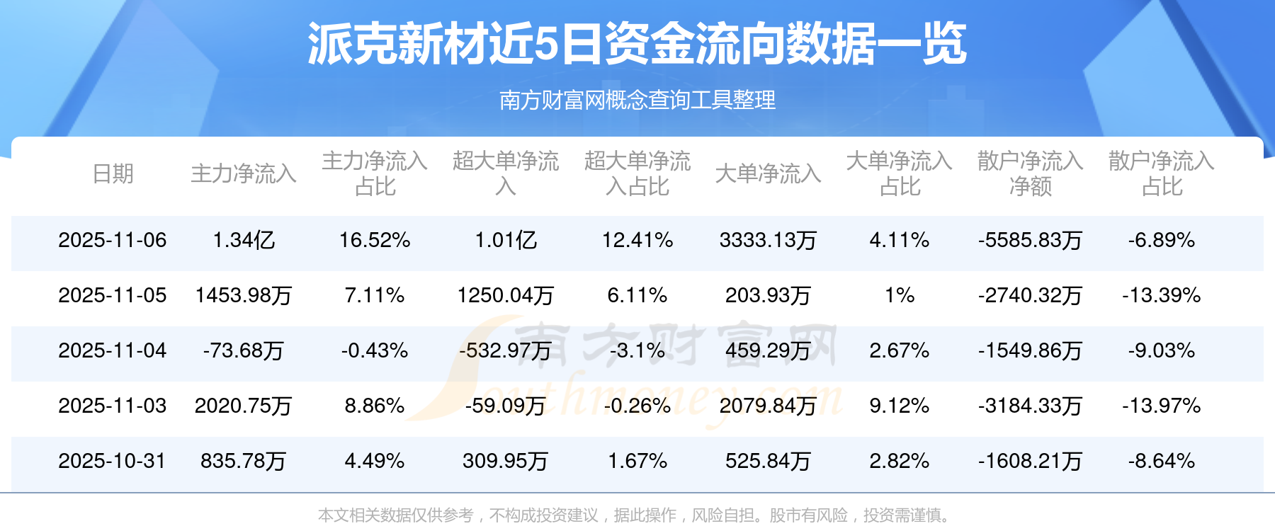 資金流向數(shù)據(jù)方面,11月6日主力資金凈流流入1.34億元,超大單資金凈流入1.01億元,大單資金凈流入3333.13萬元,散戶資金凈流出5585.83萬元。