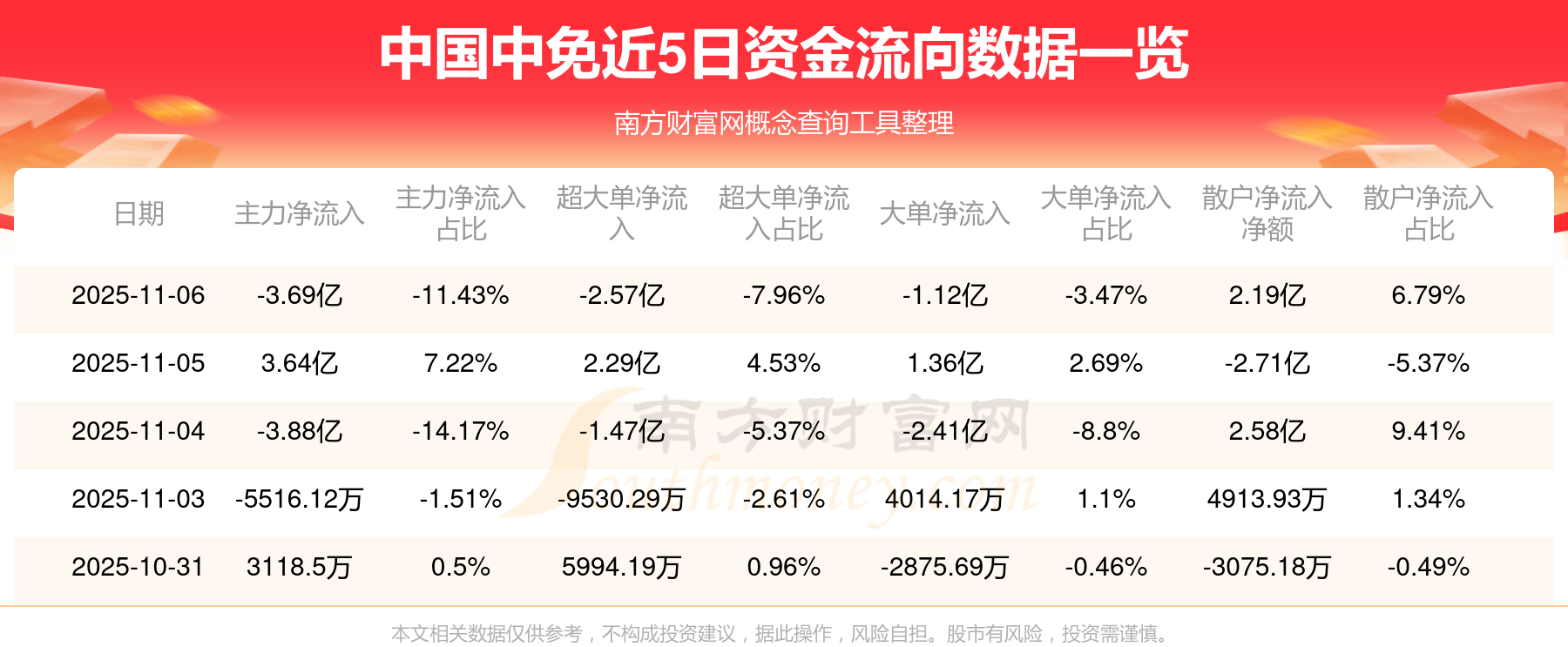 資金流向數(shù)據(jù)方面,11月6日主力資金凈流流出3.69億元,超大單資金凈流出2.57億元,大單資金凈流出1.12億元,散戶資金凈流入2.19億元。