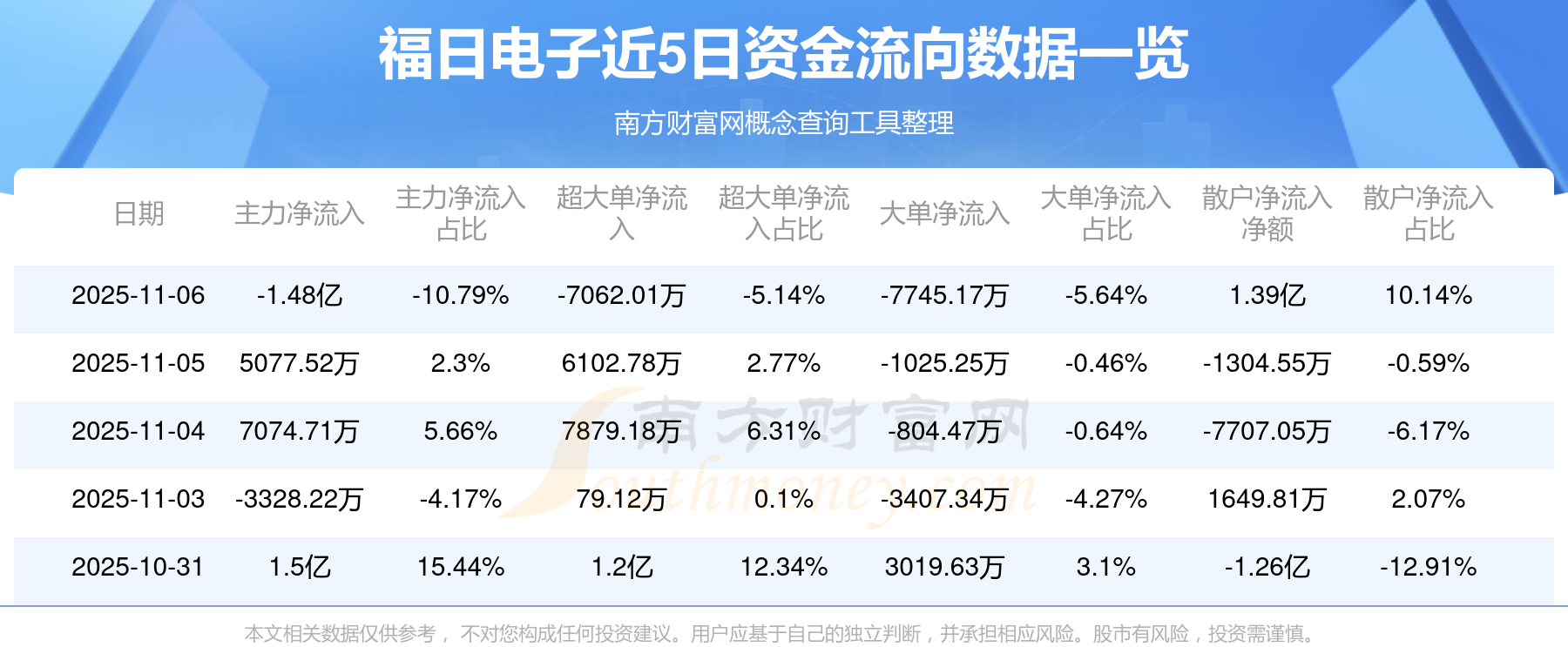 11月6日消息,福日電子11月6日主力資金凈流出1.48億元,超大單資金凈流出7062.01萬元,大單資金凈流出7745.17萬元,散戶資金凈流入1.39億元。