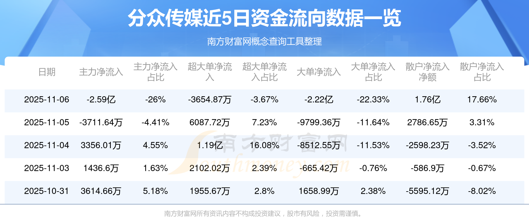11月6日消息,分眾傳媒資金凈流出2.59億元,超大單資金凈流出3654.87萬(wàn)元,換手率0.91%,成交金額9.95億元。