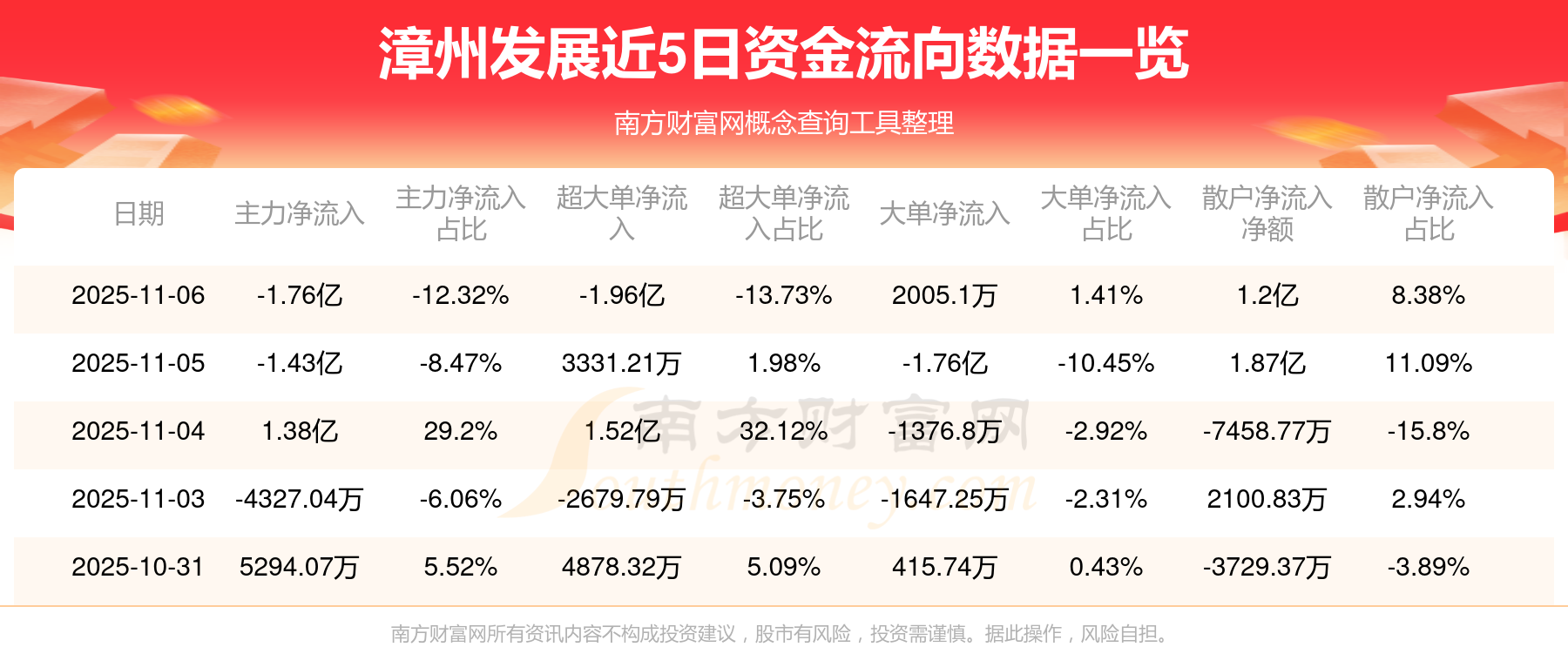 11月6日消息,漳州發(fā)展主力資金凈流出1.76億元,超大單資金凈流出1.96億元,散戶資金凈流入1.2億元。