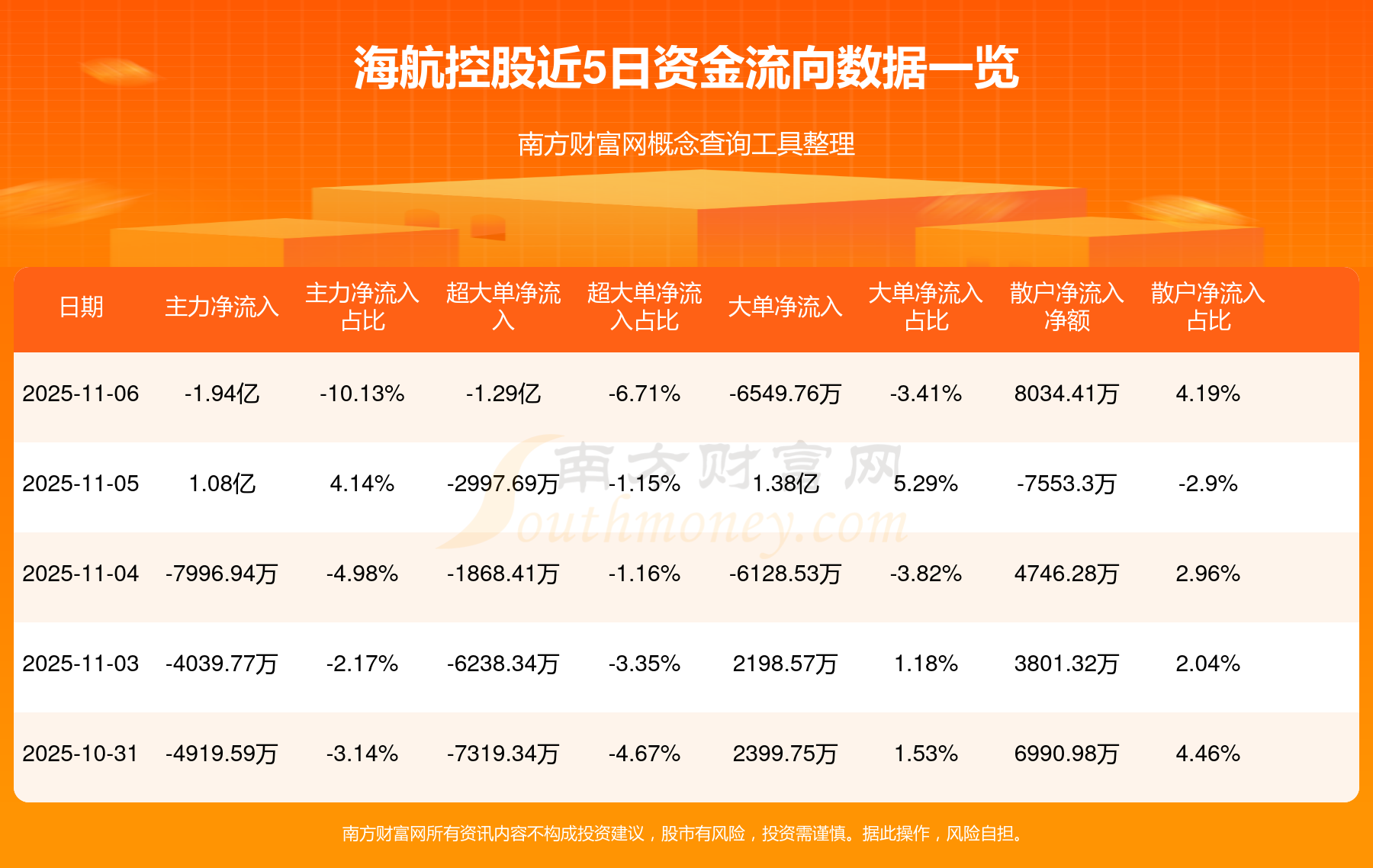11月6日消息,海航控股資金凈流出1.94億元,超大單資金凈流出1.29億元,換手率3.18%,成交金額19.05億元。