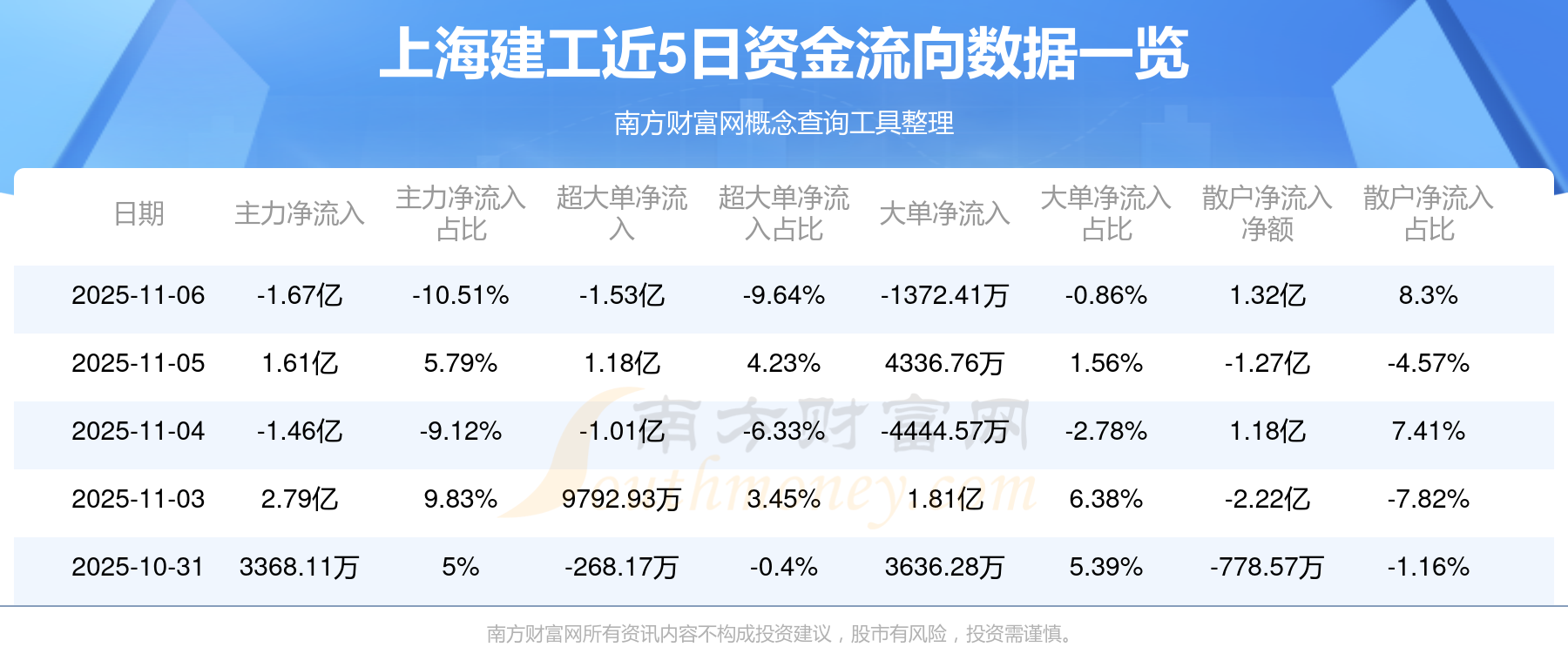 11月6日消息,上海建工11月6日主力凈流出1.67億元,超大單凈流出1.53億元,大單凈流出1372.41萬元,散戶凈流入1.32億元。