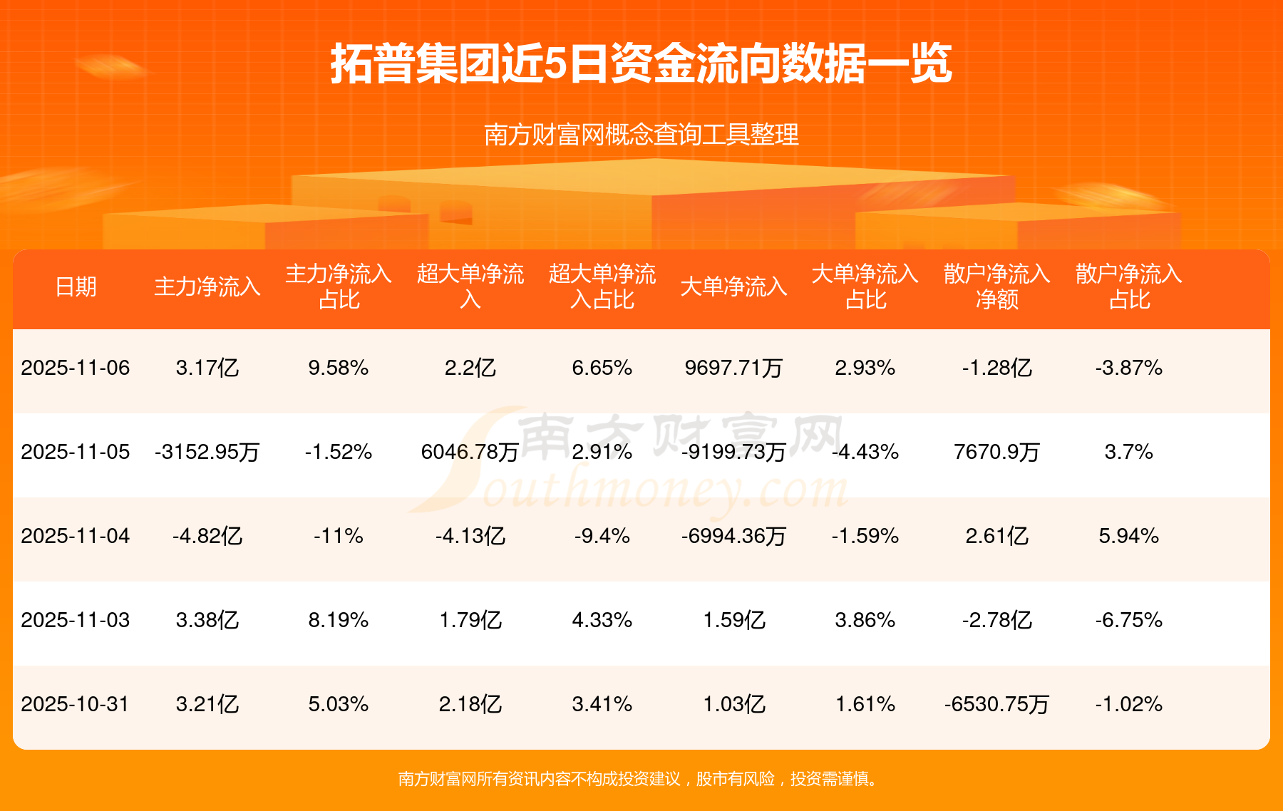 11月6日消息,拓普集團(tuán)11月6日主力資金凈流入3.17億元,超大單資金凈流入2.2億元,大單資金凈流入9697.71萬元,散戶資金凈流出1.28億元。