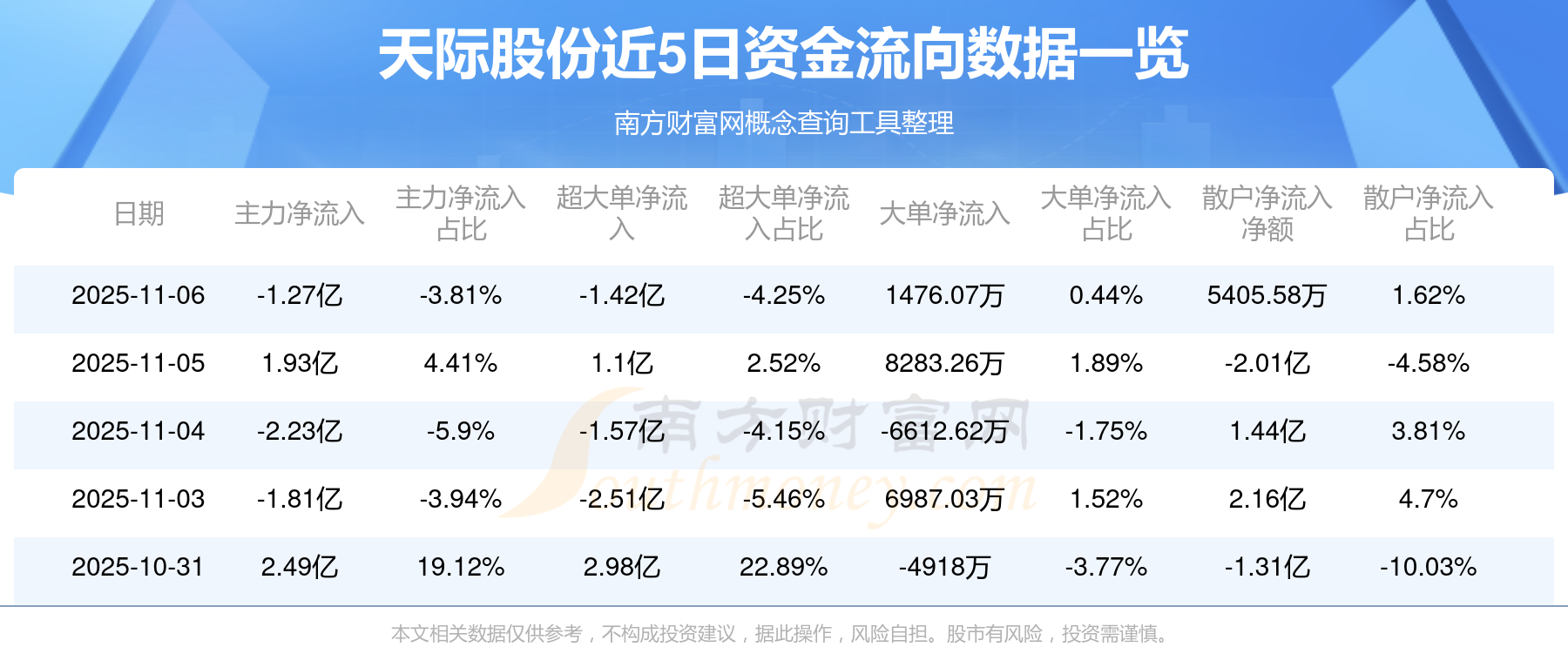 11月6日消息,天際股份11月6日主力凈流出1.27億元,超大單凈流出1.42億元,大單凈流入1476.07萬元,散戶凈流入5405.58萬元。
