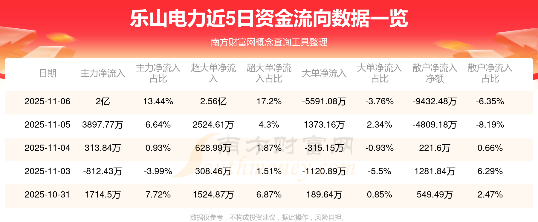 11月6日消息,樂山電力主力資金凈流入2億元,超大單資金凈流入2.56億元,散戶資金凈流出9432.48萬元。