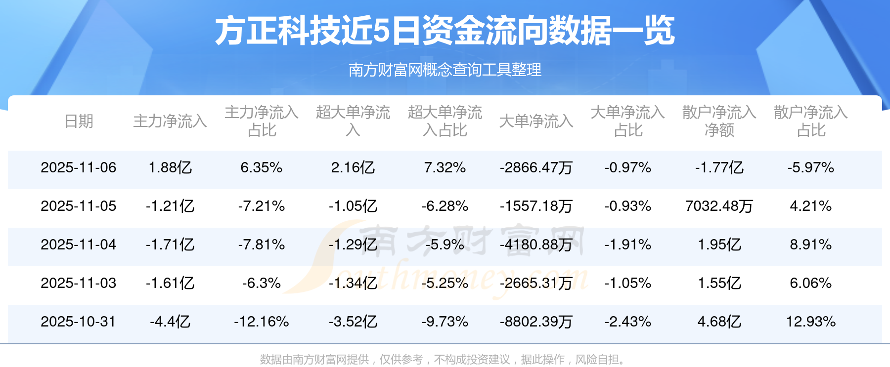 11月6日消息,方正科技主力資金凈流入1.88億元,超大單資金凈流入2.16億元,散戶資金凈流出1.77億元。