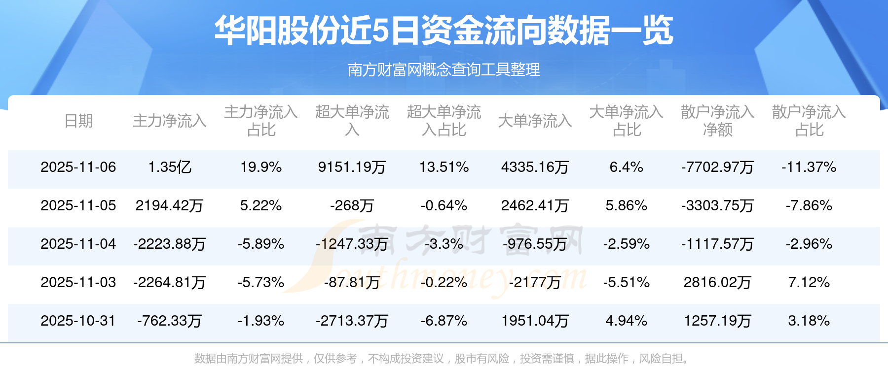 11月6日消息,華陽股份資金凈流入1.35億元,超大單資金凈流入9151.19萬元,換手率2.25%,成交金額6.78億元。