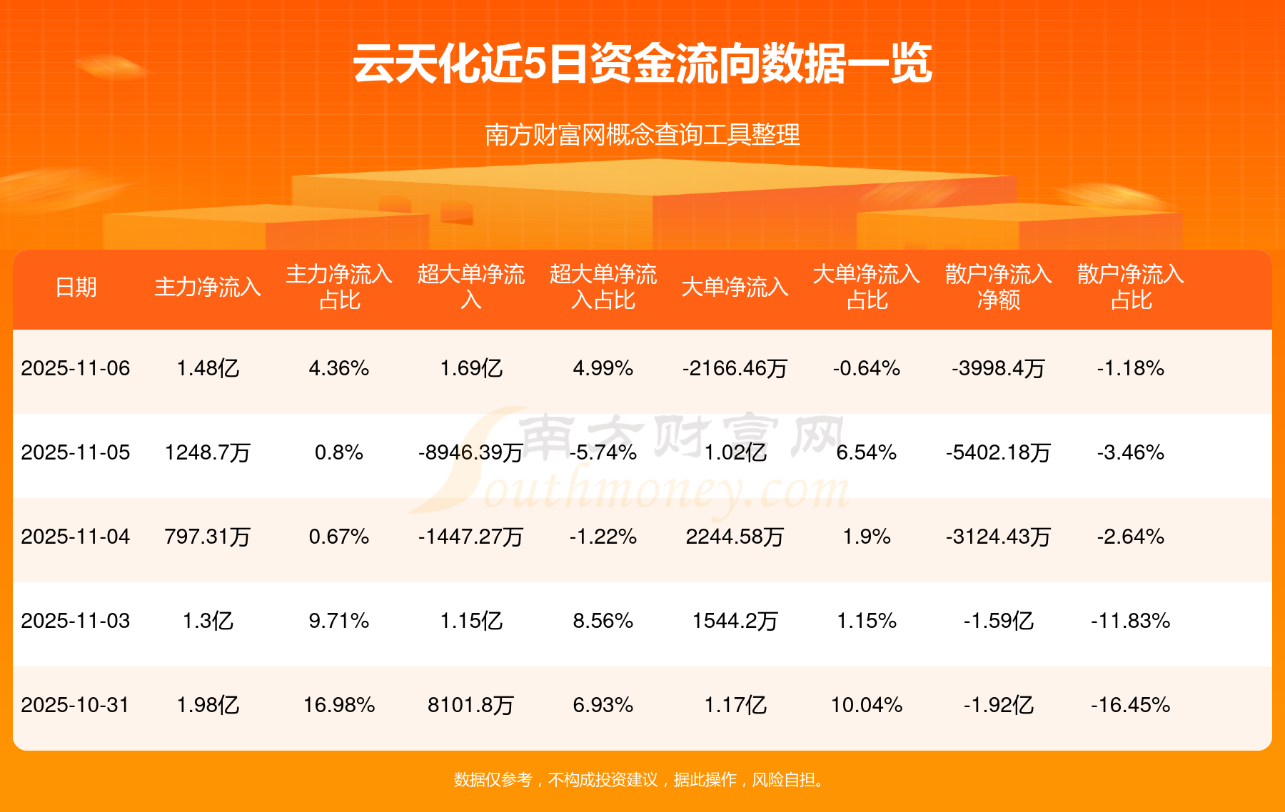 11月6日消息,云天化11月6日主力凈流入1.48億元,超大單凈流入1.69億元,大單凈流出2166.46萬元,散戶凈流出3998.4萬元。