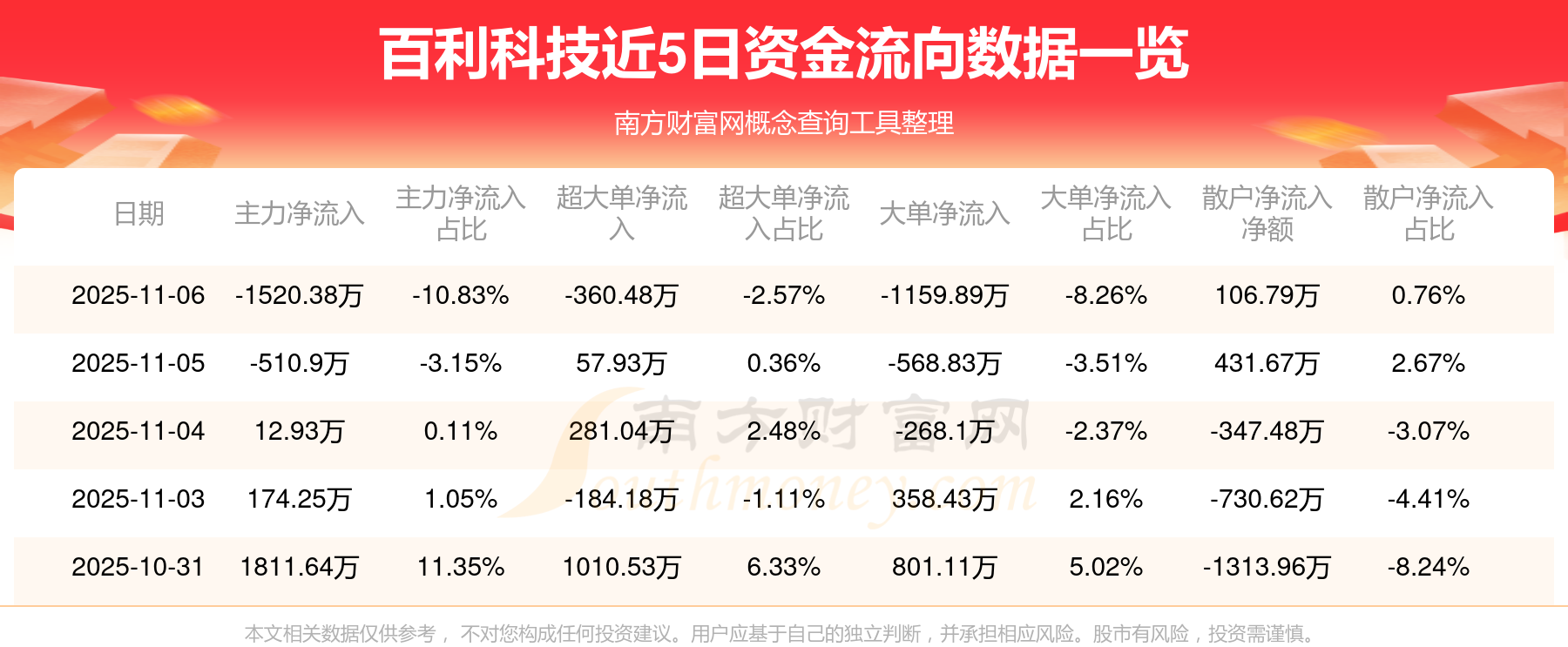 11月6日消息,百利科技資金凈流出1520.38萬元,超大單資金凈流出360.48萬元,換手率0.84%,成交金額2914.64萬元。