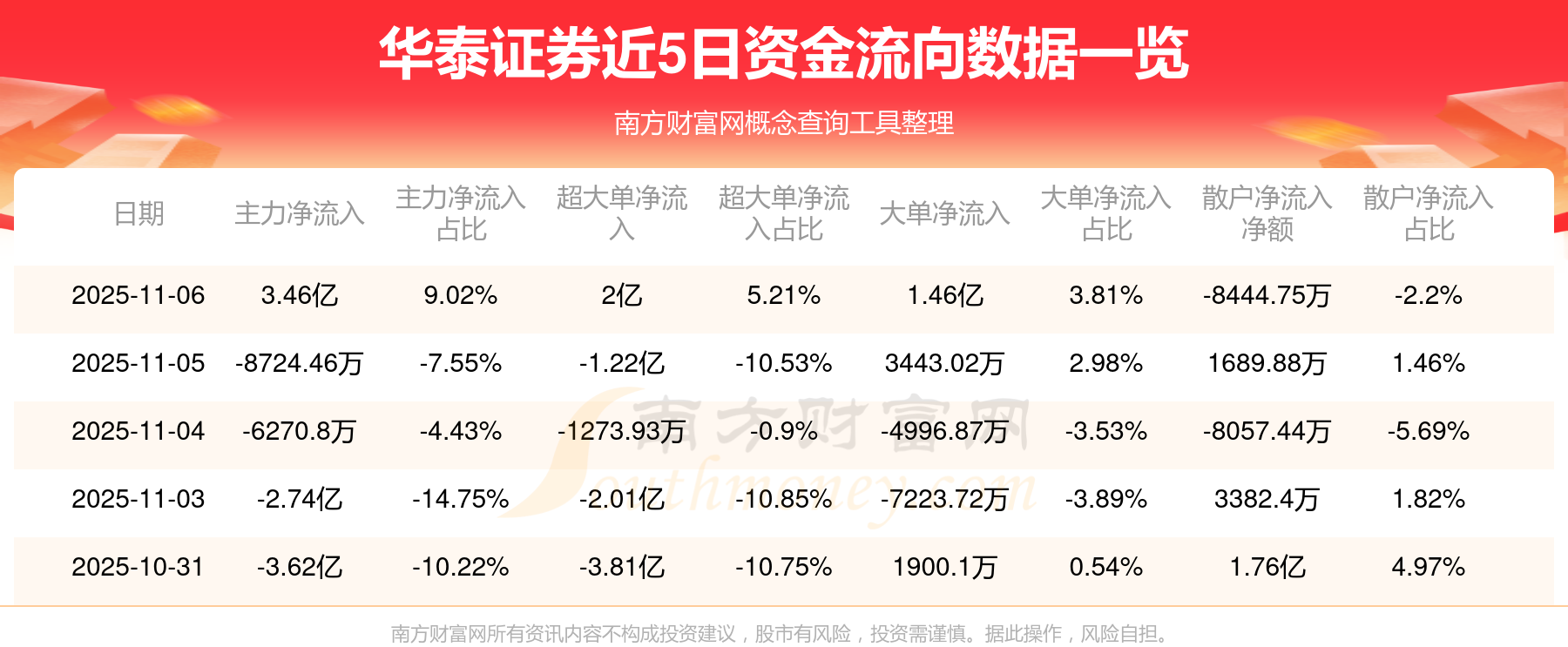 11月6日消息,華泰證券主力凈流入3.46億元,超大單凈流入2億元,散戶(hù)凈流出8444.75萬(wàn)元。