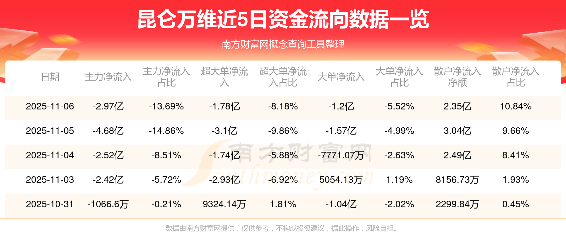 11月6日消息,昆侖萬維11月6日主力資金凈流出2.97億元,超大單資金凈流出1.78億元,大單資金凈流出1.2億元,散戶資金凈流入2.35億元。