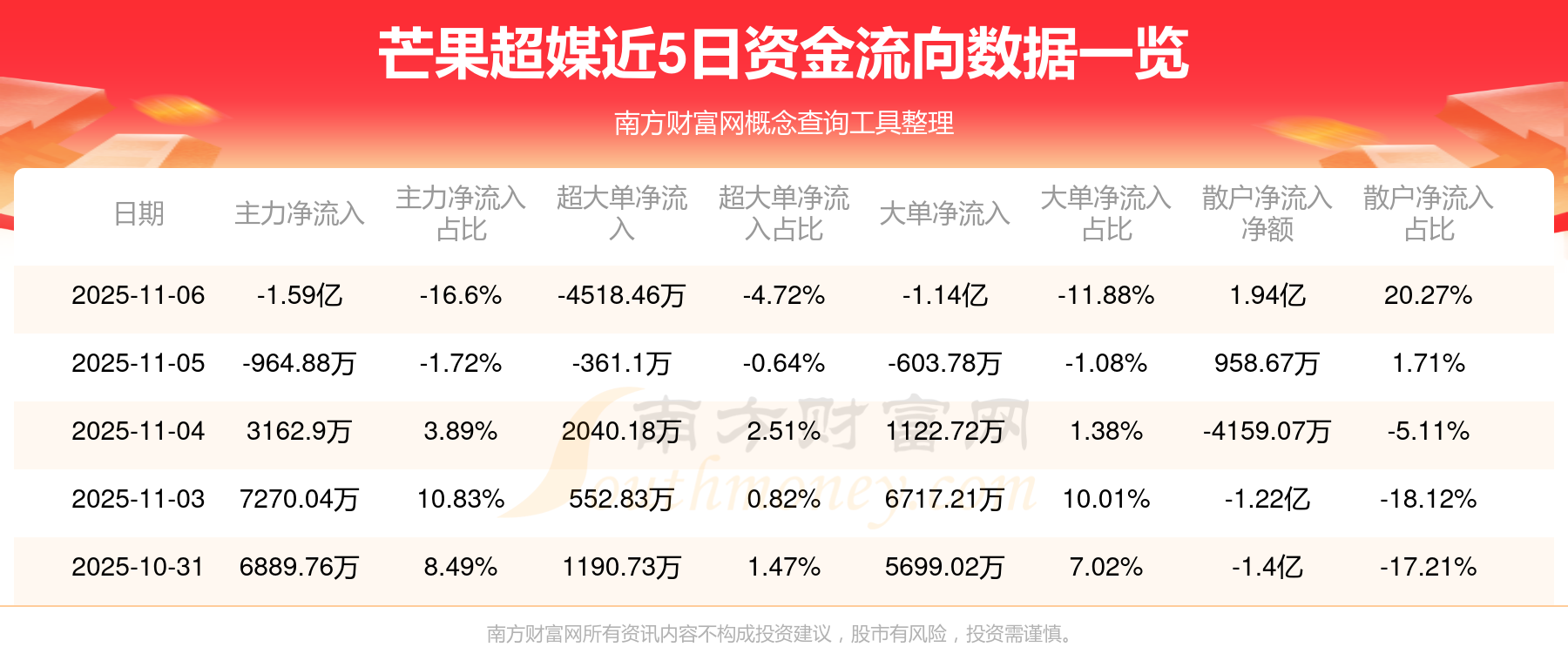 11月6日消息,芒果超媒主力凈流出1.59億元,超大單凈流出4518.46萬(wàn)元,散戶(hù)凈流入1.94億元。