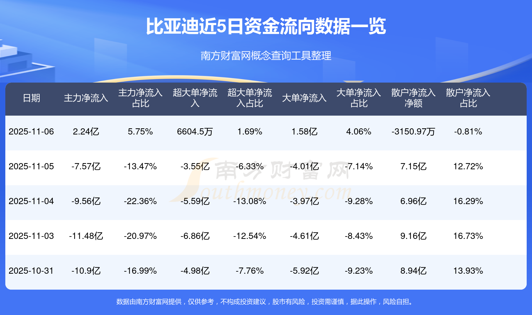 11月6日消息,比亞迪資金凈流入2.24億元,超大單資金凈流入6604.5萬元,換手率0.55%,成交金額18.72億元。