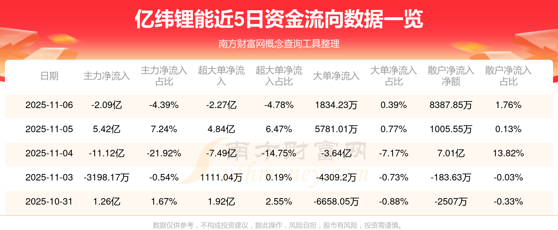 11月6日消息,億緯鋰能11月6日主力資金凈流出2.09億元,超大單資金凈流出2.27億元,大單資金凈流入1834.23萬(wàn)元,散戶資金凈流入8387.85萬(wàn)元。