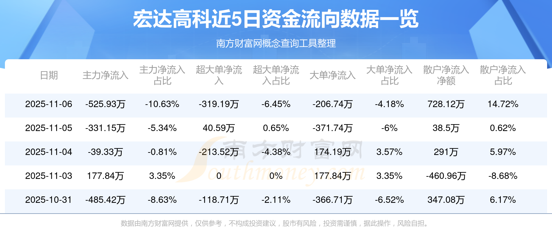 11月6日消息,宏達(dá)高科11月6日主力凈流出525.93萬(wàn)元,超大單凈流出319.19萬(wàn)元,大單凈流出206.74萬(wàn)元,散戶凈流入728.12萬(wàn)元。