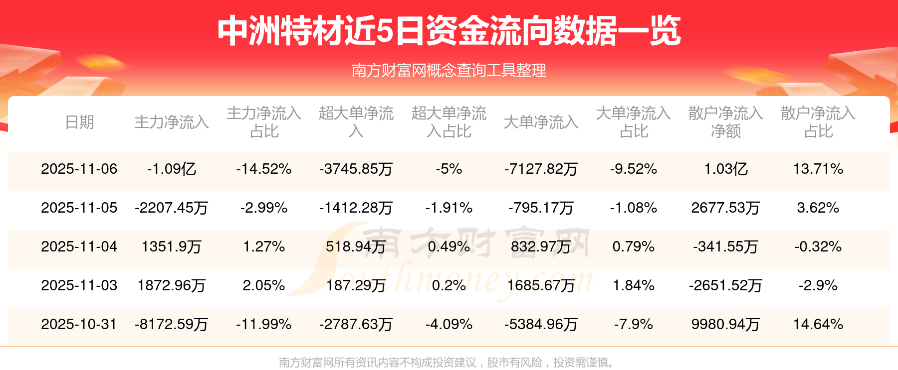 11月6日消息,中洲特材主力資金凈流出1.09億元,超大單資金凈流出3745.85萬元,散戶資金凈流入1.03億元。