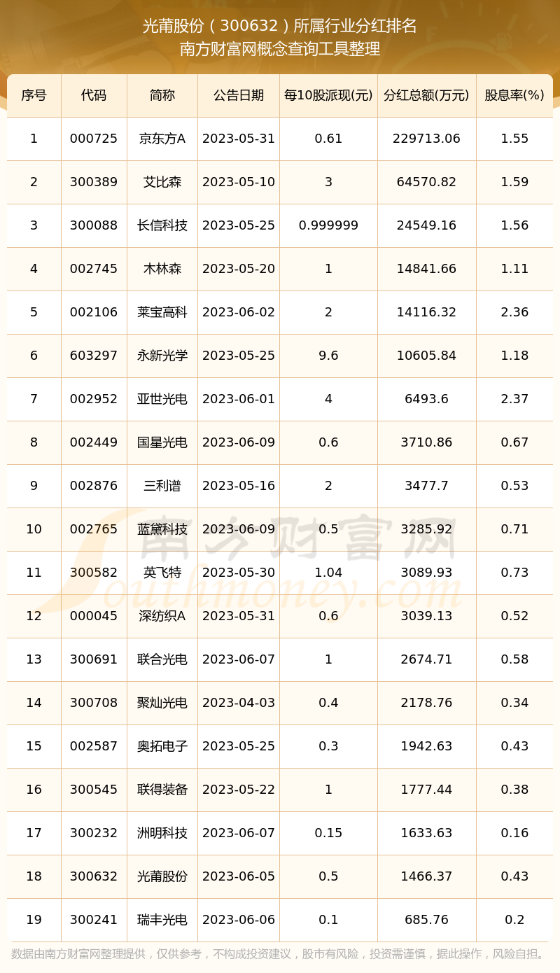 按照南方財富網(wǎng)趨勢選股系統(tǒng)統(tǒng)計,光莆股份所屬行業(yè)為光學(xué)光電子行業(yè),光學(xué)光電子行業(yè)分紅排名情況如下表: