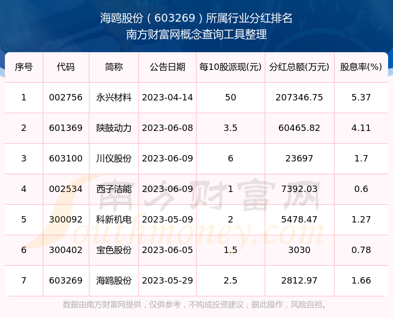按照南方財(cái)富網(wǎng)趨勢(shì)選股系統(tǒng)統(tǒng)計(jì),海鷗股份所屬行業(yè)為通用設(shè)備行業(yè),通用設(shè)備行業(yè)分紅排名情況如下表: