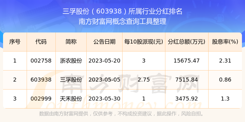 按照南方財(cái)富網(wǎng)趨勢選股系統(tǒng)統(tǒng)計(jì),三孚股份所屬行業(yè)為有機(jī)硅行業(yè),有機(jī)硅行業(yè)分紅排名情況如下表:
