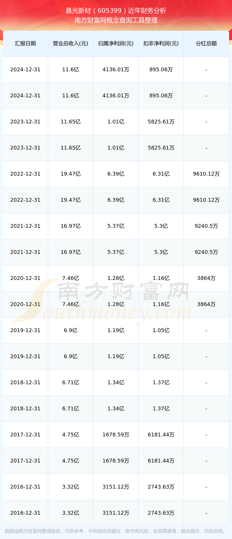 2024年報(bào)顯示,晨光新材實(shí)現(xiàn)營收11.6億,同比增長(zhǎng)-0.42%;凈利潤(rùn)4136.01萬,同比增長(zhǎng)-59.14%;毛利率14.84%。