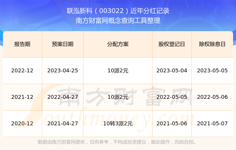 聯(lián)泓新科最新一次公布的分紅方案為10派2元。本次權(quán)益分派股權(quán)登記日為2023年5月4日,除權(quán)除息日為2023年5月5日,派息日為2023年5月5日。