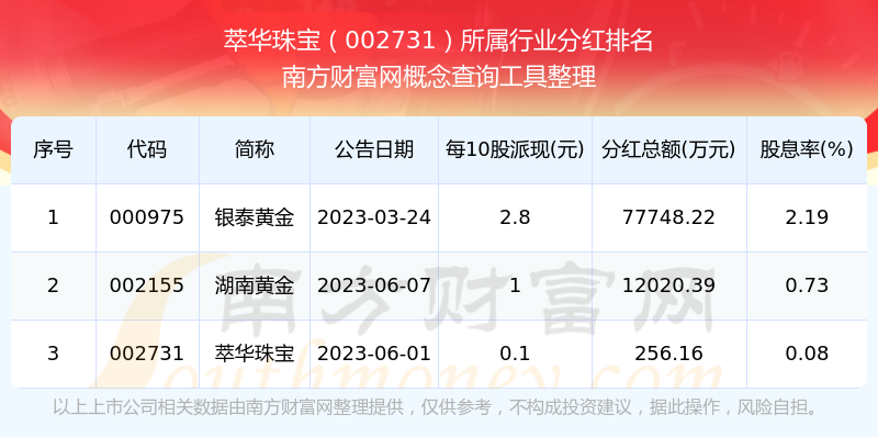 按照南方財(cái)富網(wǎng)趨勢選股系統(tǒng)統(tǒng)計(jì),萃華珠寶所屬行業(yè)為黃金行業(yè),黃金行業(yè)分紅排名情況如下表: