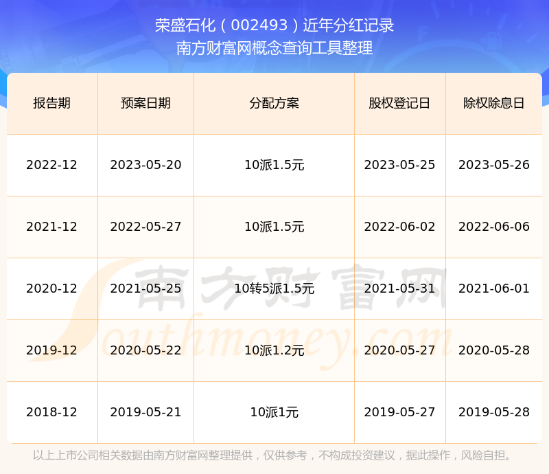 榮盛石化最新一次公布的分紅方案為10派1.5元。本次權益分派股權登記日為2023年5月25日,除權除息日為2023年5月26日,派息日為2023年5月26日。