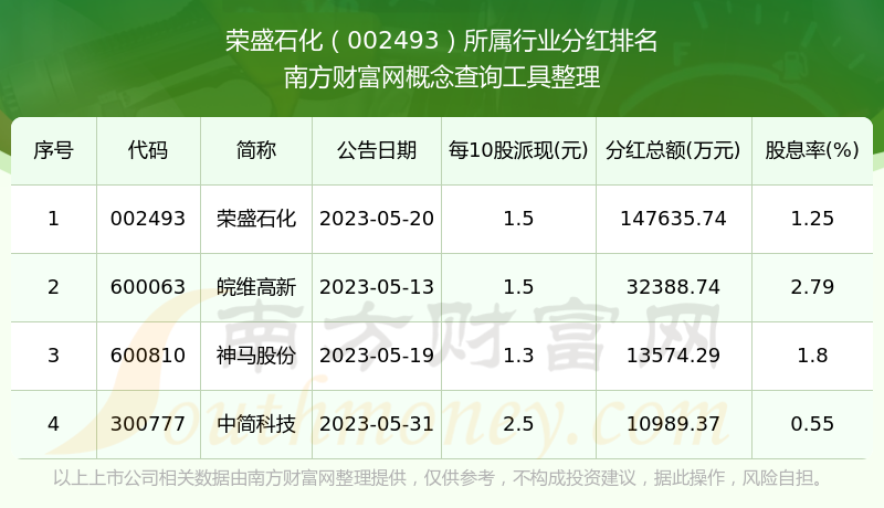 按照南方財富網趨勢選股系統(tǒng)統(tǒng)計,榮盛石化所屬行業(yè)為化纖行業(yè)行業(yè),化纖行業(yè)行業(yè)分紅排名情況如下表: