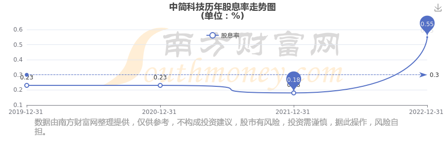 近年中簡(jiǎn)科技年度股息率走勢(shì)如下圖: