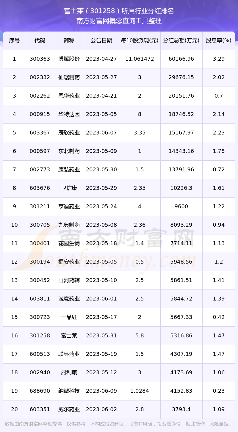 按照南方財(cái)富網(wǎng)趨勢(shì)選股系統(tǒng)統(tǒng)計(jì),富士萊所屬行業(yè)為化學(xué)制藥行業(yè),化學(xué)制藥行業(yè)分紅排名情況如下表: