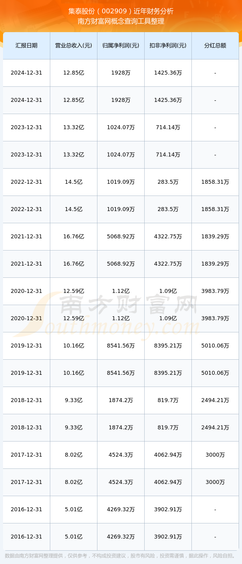 集泰股份歷年分紅派息情況如下表所示: