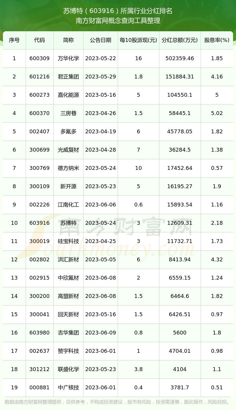 按照南方財(cái)富網(wǎng)趨勢(shì)選股系統(tǒng)統(tǒng)計(jì),蘇博特所屬行業(yè)為化學(xué)制品行業(yè),化學(xué)制品行業(yè)分紅排名情況如下表: