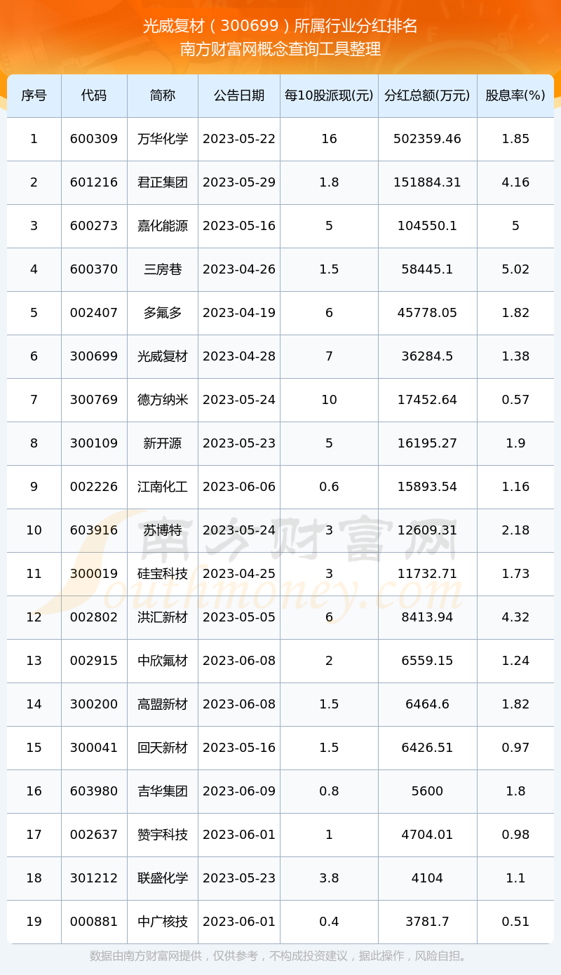 按照南方財(cái)富網(wǎng)趨勢(shì)選股系統(tǒng)統(tǒng)計(jì),光威復(fù)材所屬行業(yè)為碳纖維行業(yè),碳纖維行業(yè)分紅排名情況如下表: