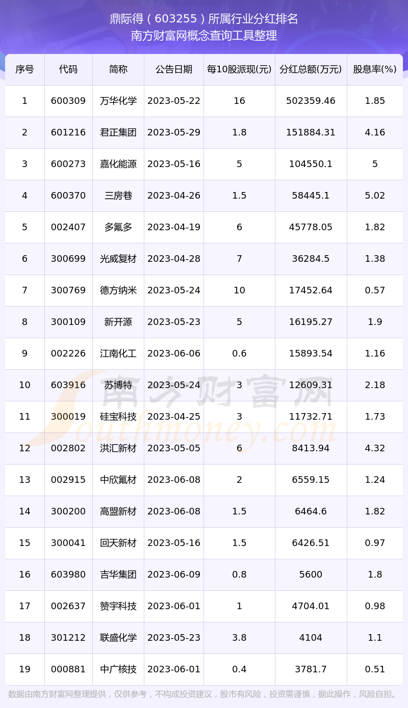 按照南方財(cái)富網(wǎng)趨勢(shì)選股系統(tǒng)統(tǒng)計(jì),鼎際得所屬行業(yè)為催化劑行業(yè),催化劑行業(yè)分紅排名情況如下表: