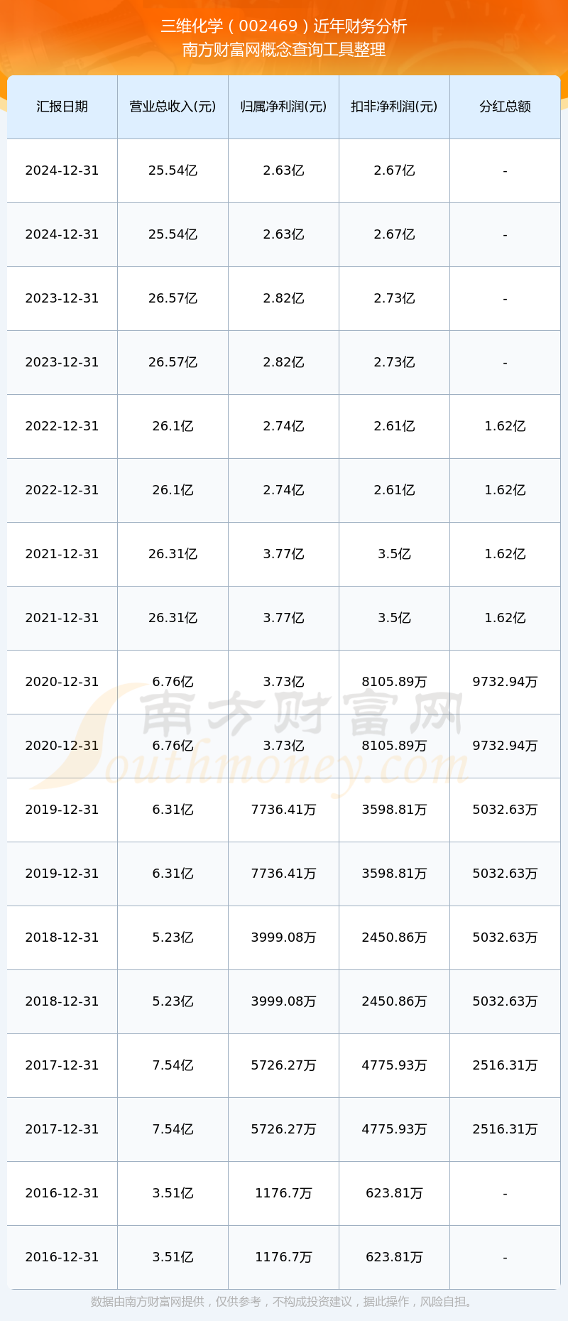 三維化學(xué)公司2024年實現(xiàn)營業(yè)收入25.54億元,同比增長-3.88%;凈利潤2.63億元,同比增長-6.92%;毛利率21.56%。
